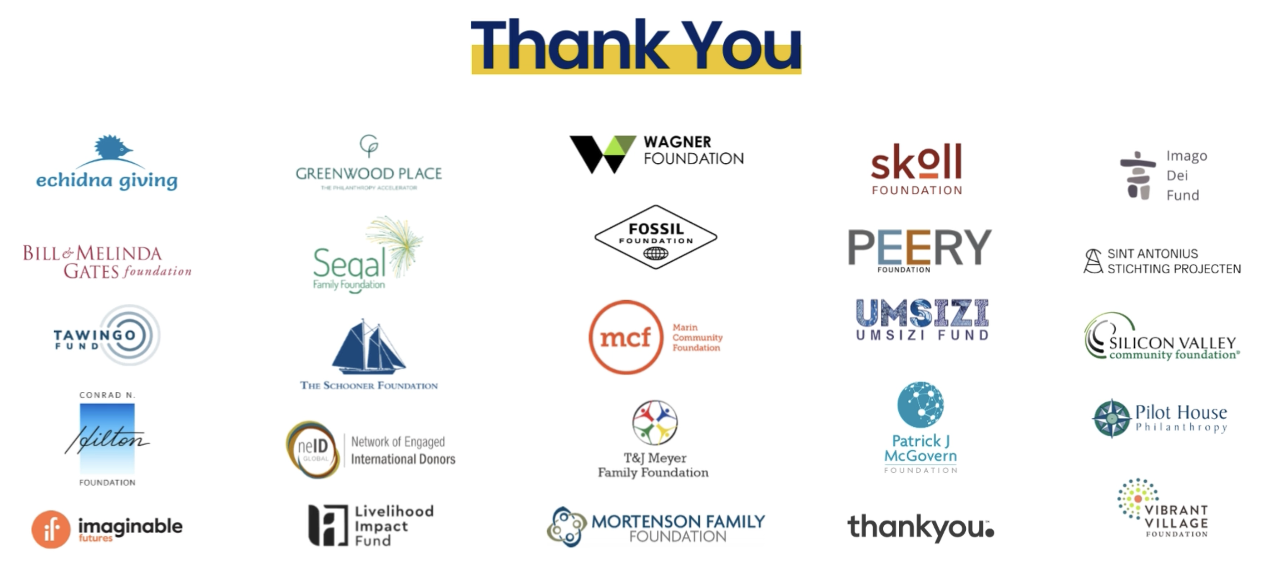 We express our profound gratitude to our funding partners. It is a privilege to be in partnership with individuals and organizations that align with our commitment to driving critical resources to African changemakers who are making a lasting impact in their communities.